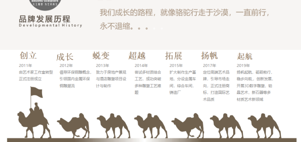 ★2015年拓展,为了更好的的提升服务品质和全面发展业务,于2015年底扩大了制作生产基地,分设金属锻造车间,玻璃钢车间,综合车间和铸造厂,承制了摩洛哥骑士铜像和群马铜雕等项目;